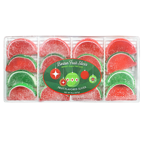 Enjoy festive cheer with the Boston Fruit Slices Holiday Tray, filled with chewy, colorful gummies in red and green. Sweet, sugary fruit flavors make these slices a fun treat for holiday parties, gift bags, or candy dishes. Brighten your celebrations with this playful and tasty candy tray!