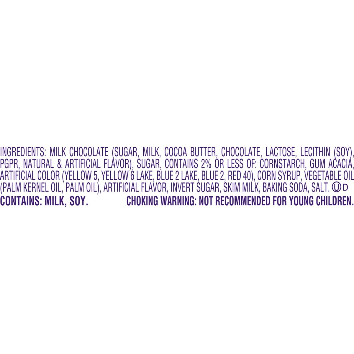 Ingredients: Milk chocolate (sugar, milk, cocoa butter, lactose, lecithin (soy), PGPR, natural flavor and artificial flavor), sugar, contains 2% or less of: cornstarch, gum acacia, corn syrup, artificial color (yellow 5, yellow 6 lake, blue 2, blue 2 lake, red 40), milk fat, invert sugar, skim milk, artificial flavor, baking soda, salt.