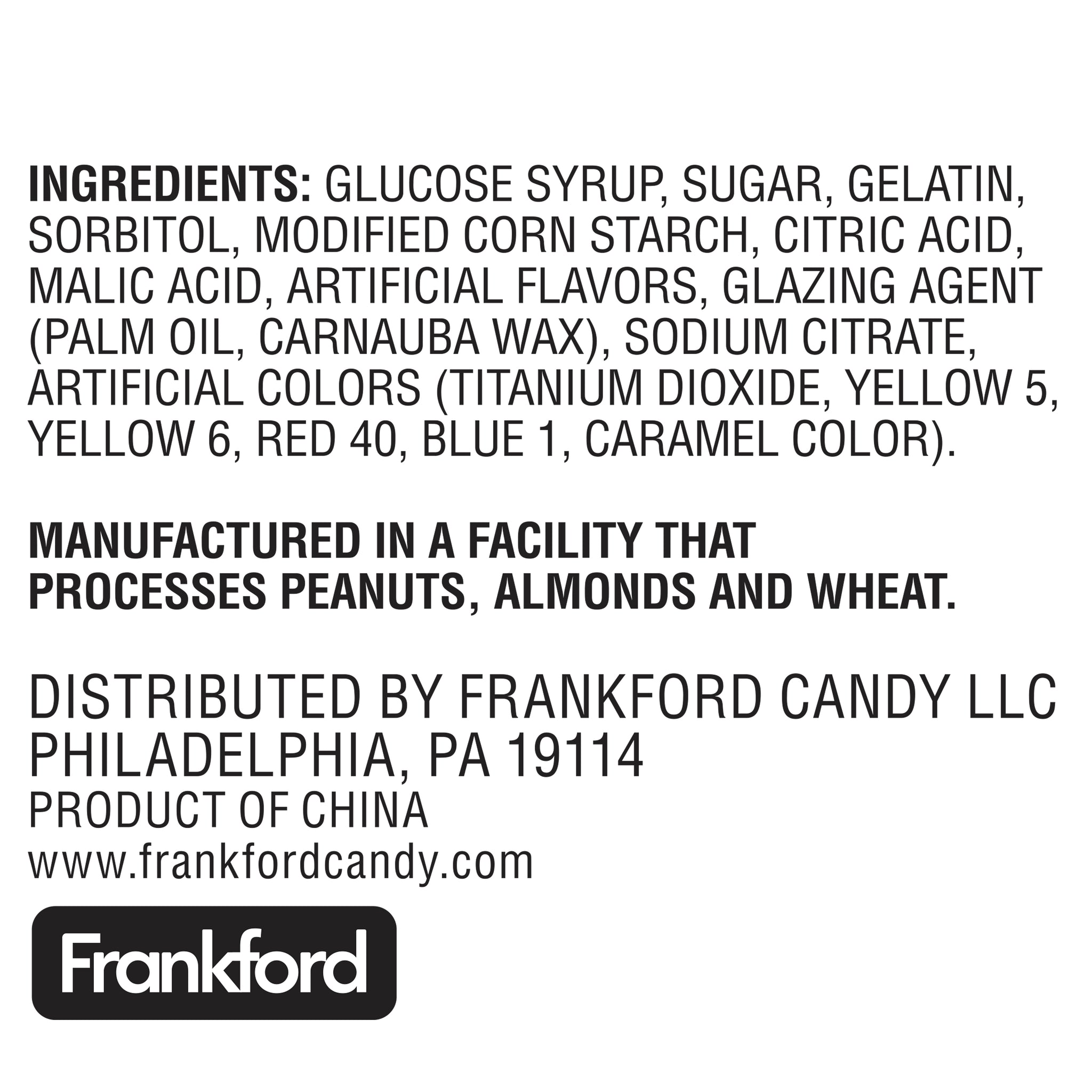Ingredients: Glucose syrup, sugar, gelatin, sorbitol, modified corn starch, citric acid, agar, malic acid, artificial flavors, glazing agent (palm oil, carnauba wax), sodium citrate, artificial colors (titanium dioxide, yellow 5, yellow 6, red 40, blue 1). Manufactured in a facility that processes peanuts, almonds, and wheat.