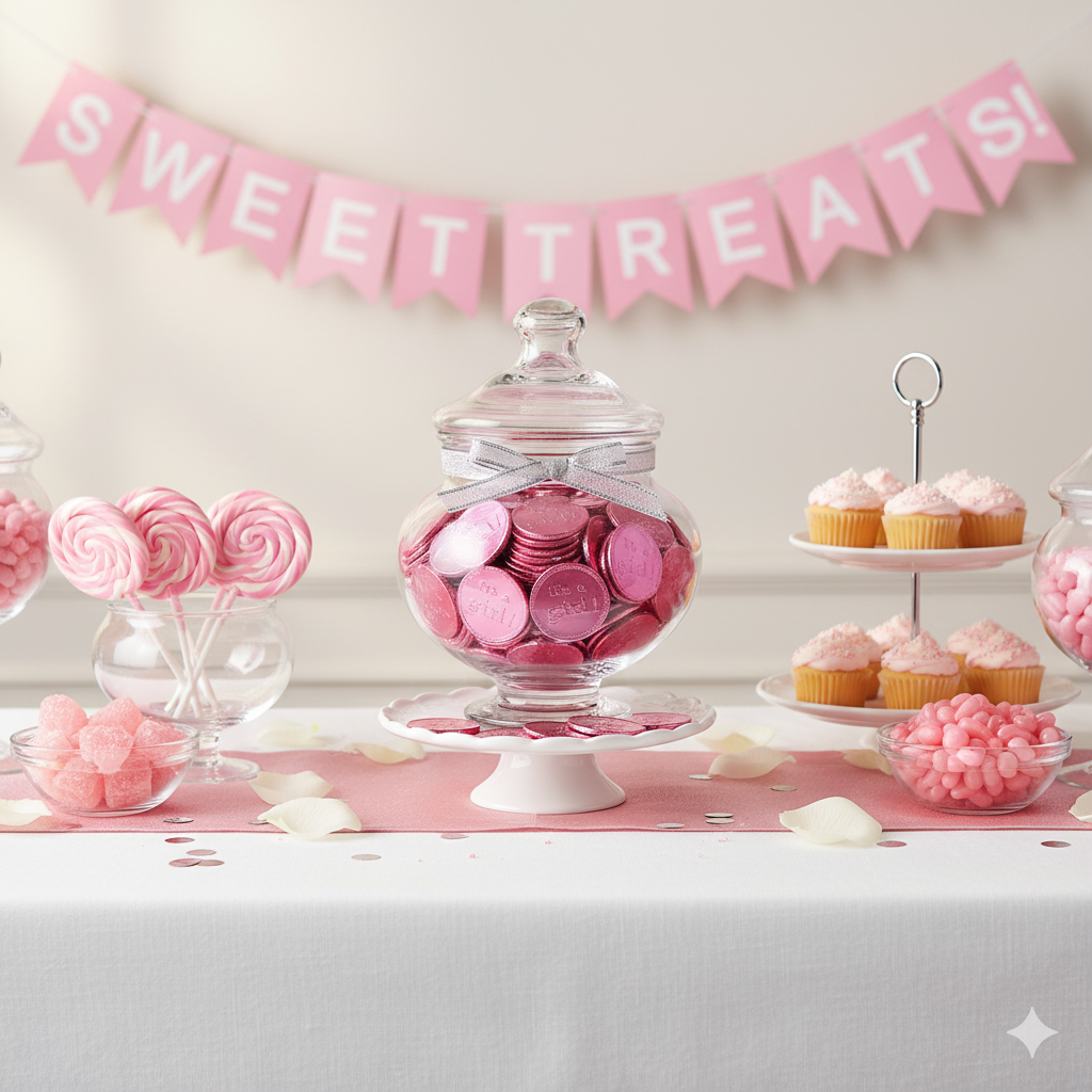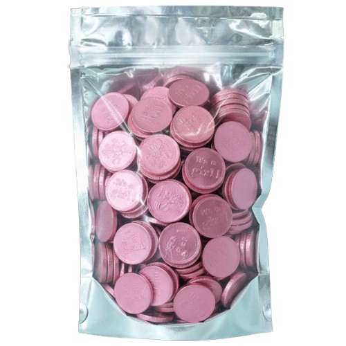 Your special event deserves a special introduction into this world. These chocolate coins are wrapped in pastel-pink foil and embossed with the words "It's a Girl" and an image of a stork. Great to for baby showers, birth announcements, and at the hospital (where they forbid cigars). Each coin is approximately 1-1/2" in diameter