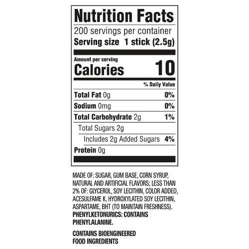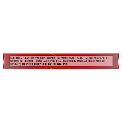 INGREDIENTS: SUGAR, GUM BASE, CORN SYRUP, NATURAL AND ARTIFICIAL FLAVORS; LESS THAN 2% OF: GLYCEROL, SOY LECITHIN, COLOR ADDED, ACESULFAME K, HYDROXYLATED SOY LECITHIN, ASPARTAME, BHT (TO MAINTAIN FRESHNESS).