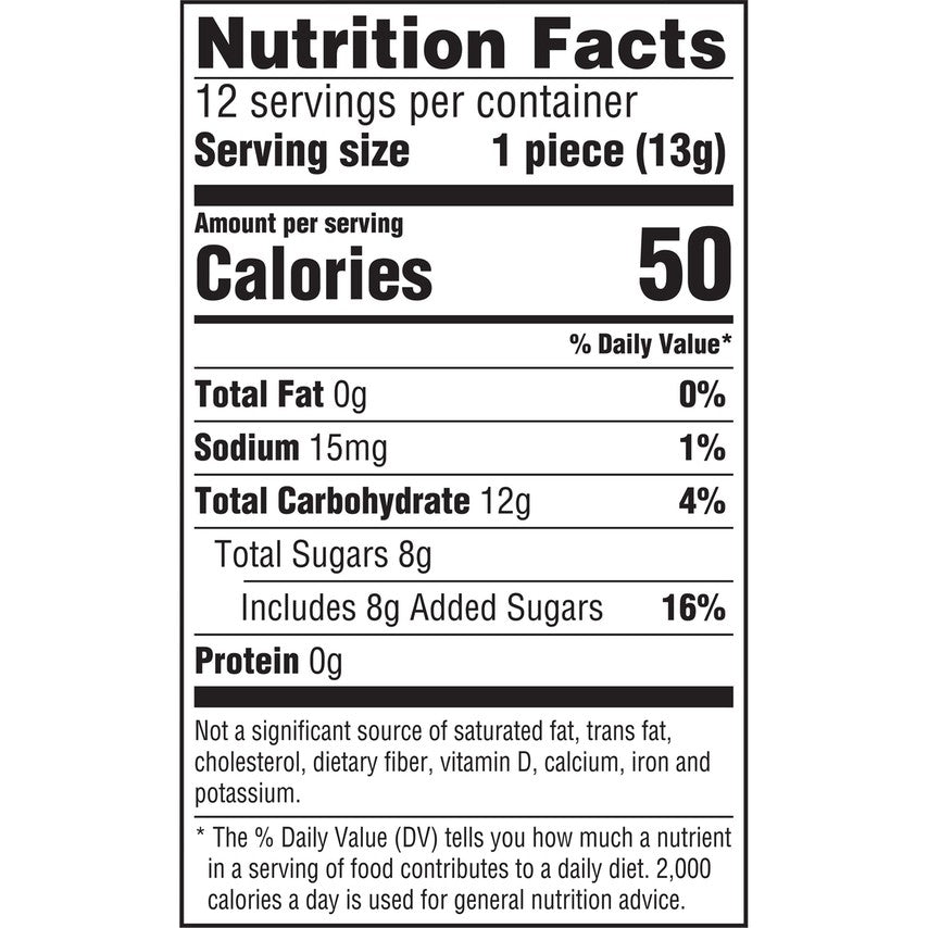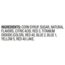 Ingredients: Corn Syrup, Sugar, Natural Flavors, Citric Acid, Red 3, Titanium Dioxide (Color), Red 40, Blue 2, Blue 1, Yellow 5, Red 40 Lake.