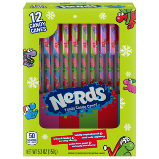 These tangy Nerds candy canes are a tart twist on the typical candy cane. Three mixed flavors including totally tropical punch & road rash raspberry, what-A-melon & so very cherry, and gotta have grape & seriously strawberry.