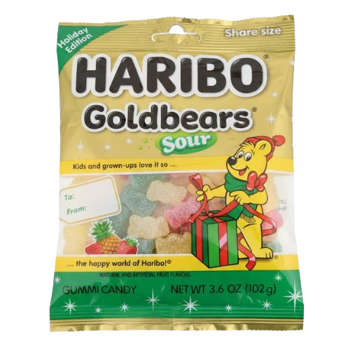 Get ready for a tangy twist with these mini bears! Bursting with sour then sweet flavors. Perfectly sized in a small peg bag, they make a great little treat. Decked out in festive red, white, and green, these Haribo Goldbears are Christmas-ready, complete with a cute To/From label—ideal for sharing holiday cheer. Flavors? Raspberry (Red), Pineapple (White), and Strawberry (Green) delight your taste buds bite after bite!