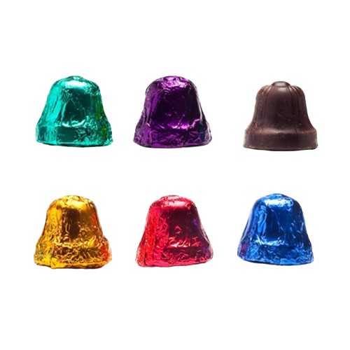 Tiny, intricately designed premium dark chocolate bells wrapped in dazzling jewel-toned Italian foil. They’re perfect for stuffing gift bags, party favors, balloon weights, candy jars, Christmas stockings, or spicing up your holiday table.