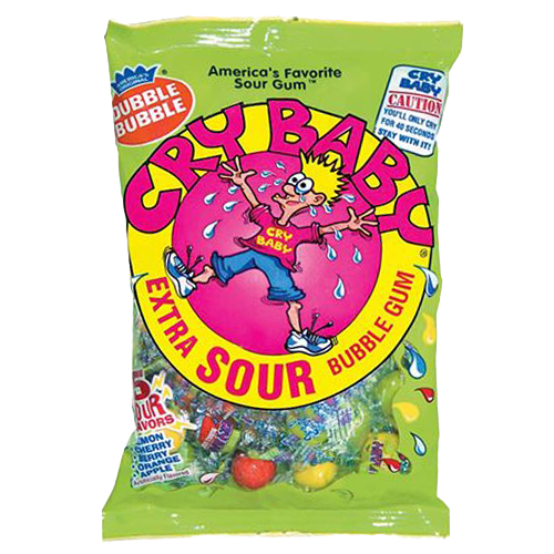 Super sour sugary yoweee-zowee: Cry Baby Extra Sour is the sourest gum on the market. Gumballs are 3/4", in assorted flavors including: lemon, cherry, apple, blue raspberry and orange.