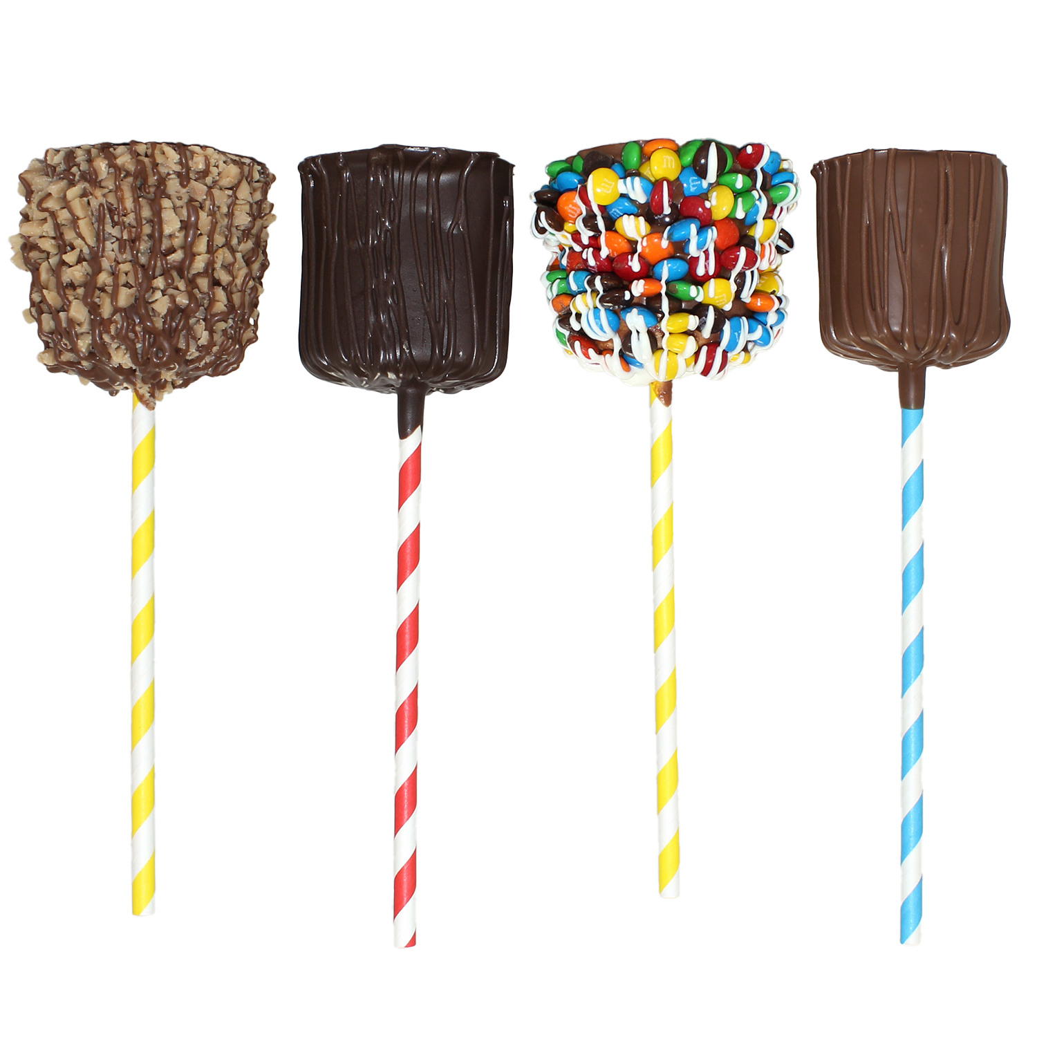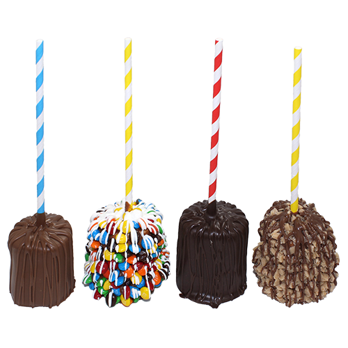 A scrumptious, chocolatey treat on a stick! We drench giant marshmallows in our creamy gourmet milk or dark chocolate and adorn them with a stick for easy snacking. For a more decedent treat we also coat them with sweet candy toppings of Heath Crunch or Mini M&M's.