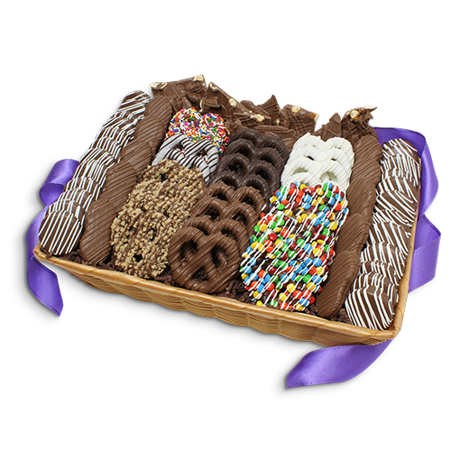 The Ultimate in gourmet, chocolate-covered gifts, this beautiful basket contains a sampling of all our favorite goodies. Just one of the many delicious offerings in our collection of gourmet chocolate-covered confections, perfect for knot-so-ordinary gift giving.