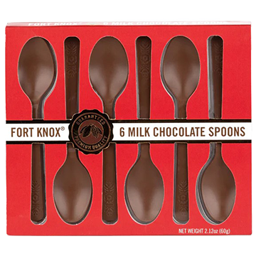 Delicious Fort Knox Milk Chocolate Spoons can be enjoyed with a dollop of cream or ice cream in the center, use them to stir hot chocolate, or enjoy it solo! These spoons are functional and come in tasty milk chocolate. Packs of 6 spoons makes it perfect to enjoy with family and friends.