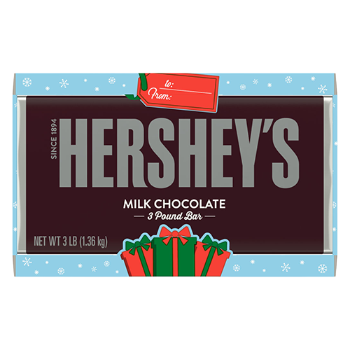 Unwrap joy this season! This HERSHEY’S Holiday Milk Chocolate Candy Bar is the perfect present for the chocolate lovers on your list. Three pounds of solid HERSHEY’S Milk Chocolate, it’s creamy, delicious and classic. The wrapper features an adorable ribbon design with a tag to write who it’s for. Buy one today and make our cherished recipe part of your holiday tradition.