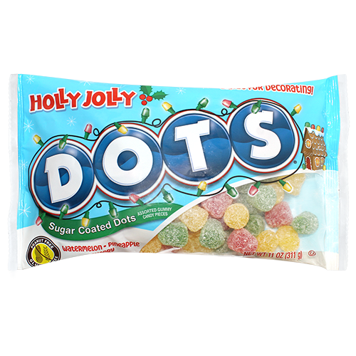 These sugar-coated Dots are a delightful mix of assorted gummy candies, perfect for adding festive flair to your gingerbread house or any holiday treat. Enjoy a variety of exciting flavors with every bite in this Holly Jolly. Assortment may include flavors like Watermelon, Pineapple, Cherry.