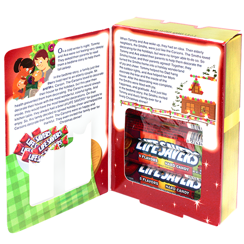 This package contains LIFE SAVERS rolls inside of a storybook. The storybook transports you with a magical story about Santa and his elves and includes craft ideas. There's so much fun to be had this holiday season with LIFE SAVERS and this sweet storybook.