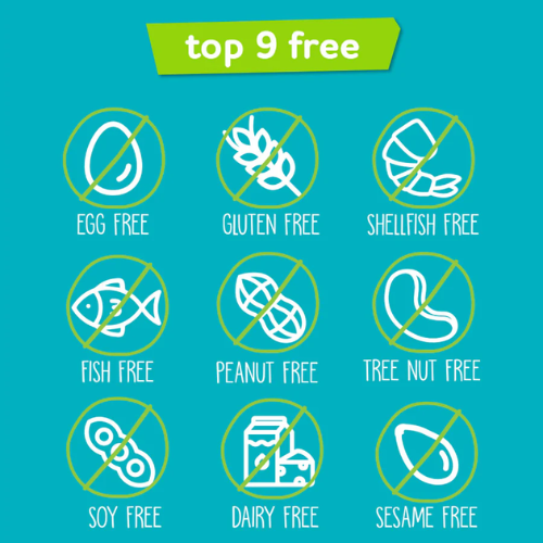 Egg free, Gluten free, Shellfish free, Fish free, Peanut free, Tree nut free, Soy free, Dairy free, Sesame free.