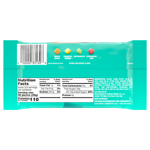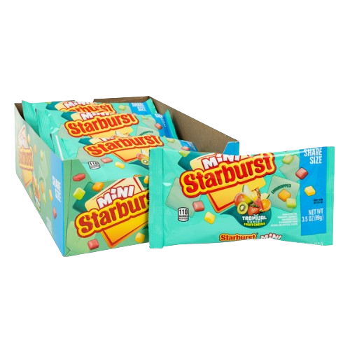 Enjoy a burst of tropical flavor with Starburst Mini Tropical Sunset fruit chews. This 3.5 oz. bag features unwrapped minis in four delicious flavors: Mango melon, Pineapple orange, Watermelon, and Strawberry kiwi. Perfect for on-the-go snacking, lunchboxes, or movie nights. Squish, smash, and savor the tropical taste experience in every bite.