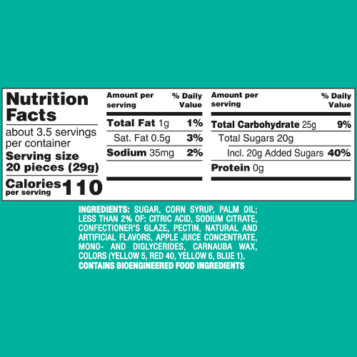 Ingredients: SUGAR, CORN SYRUP, PALM OIL; LESS THAN 2% OF: CITRIC ACID, SODIUM CITRATE, CONFECTIONER'S GLAZE, PECTIN, NATURAL AND ARTIFICIAL FLAVORS, APPLE JUICE CONCENTRATE, MONO- AND DIGLYCERIDES, CARNAUBA WAX, COLORS(YELLOW5, RED40 ,YELLOW 6,BLUE 1).
