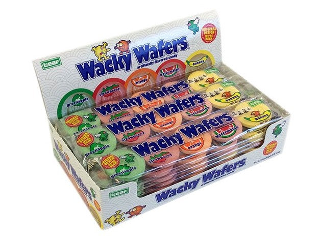 Wacky Wafers are back! Originally produced by Wonka in the 1970s, these giant fruity wafers (about 1-1/2" in diameter) have returned in their original form. Packaged side by side in a clear plastic sleeve, these crunchy, tangy treats will take you back to the happy days of your youth.