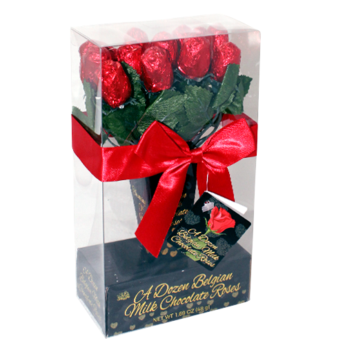 These 12 mini rose-shaped hollow chocolates come wrapped in elegant red foil in a vase which reads "Thinking of You" and "From the Heart" A perfect gift for Valentine's Day.