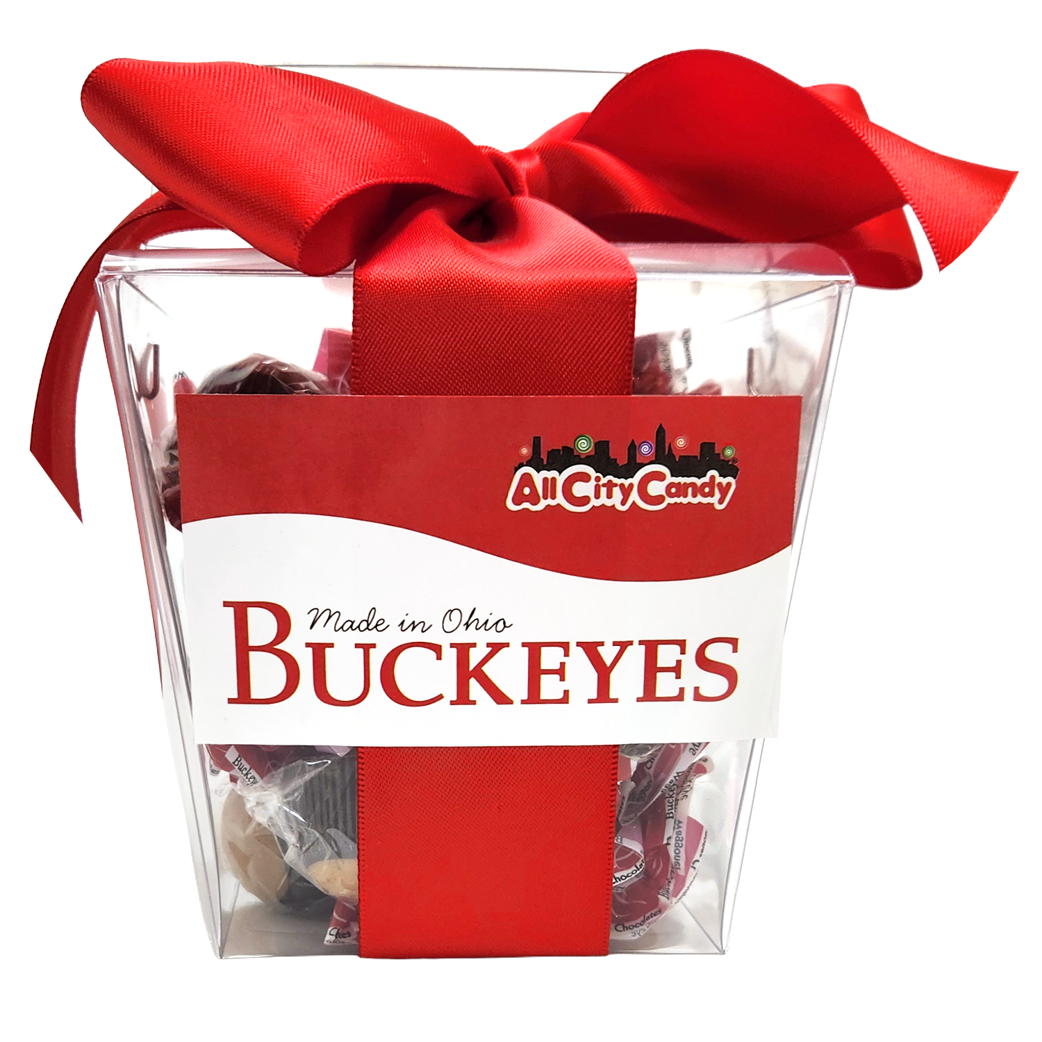This gift container is filled with individually wrapped Waggoner Buckeyes sweet taste of creamy peanut butter coated in luscious milk or dark chocolate, your preference. It's a perfect combination for anyone who loves the mouthwatering mix of chocolate and peanut butter. The clear wrapper shows off the beautiful buckeye candy and is accented with Ohio scarlet red twist. Great for parties, candy dishes, holiday events, candy buffets, candy jars, and sharing! A tradition for Ohio natives and Ohio State fans!