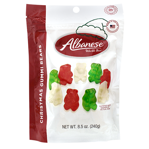 Celebrate the season with red, white, and green gummi bears bursting with wild cherry, green apple, and strawberry banana flavors. These fun, festive treats are ideal for your holiday candy spread. Each gummi bear is roughly 1" in size—sweet, chewy bites of holiday cheer!