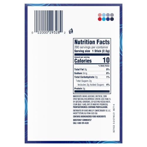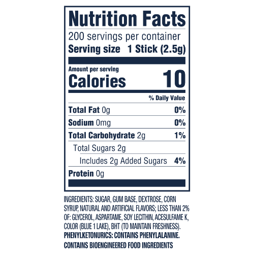 Ingredients: SUGAR, GUM BASE, DEXTROSE, CORN SYRUP, NATURAL AND ARTIFICIAL FLAVORS; LESS THAN 2% OF: GLYCEROL, ASPARTAME, SOY LECITHIN, ACESULFAME K, COLOR (BLUE 1 LAKE), BHT (TO MAINTAIN FRESHNESS).