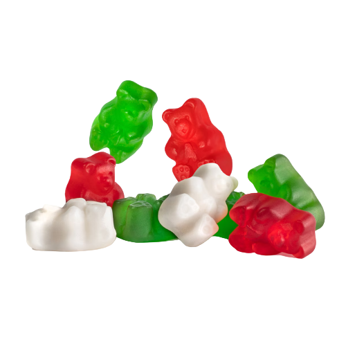 Celebrate the season with red, white, and green gummi bears bursting with wild cherry, green apple, and strawberry banana flavors. These fun, festive treats are ideal for your holiday candy spread. Each gummi bear is roughly 1" in size—sweet, chewy bites of holiday cheer!