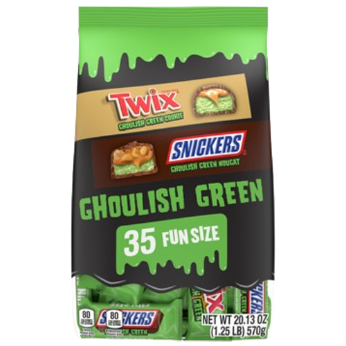This Halloween chocolate bar bag gives all the spooky Halloween colors and vibes without compromising on classic candy flavors. Each assorted chocolate candy bag contains 35 individually wrapped packs of an exclusive Halloween assortment of SNICKERS Ghoulish Green Fun Size milk chocolate bars and TWIX Ghoulish Green Fun Size caramel chocolate bars. From filling trick or treat bags to decorating ghoulish baked dessert recipes, to a scary movie night, let this Ghoulish Green milk chocolates bulk candy variety pack kick up the scare factor.