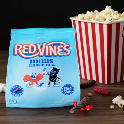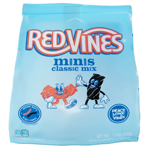 Red Vines Mini Twist Classic Mix brings together the best of both worlds—Original Red and Black Licorice in one fun bag. These petite chewy twists deliver all the nostalgic flavor you love, now in a bite-sized format perfect for snacking on the go. With playful packaging featuring high-fiving licorice characters, it's a delicious treat that brings the perfect balance of sweet and bold to your candy collection.