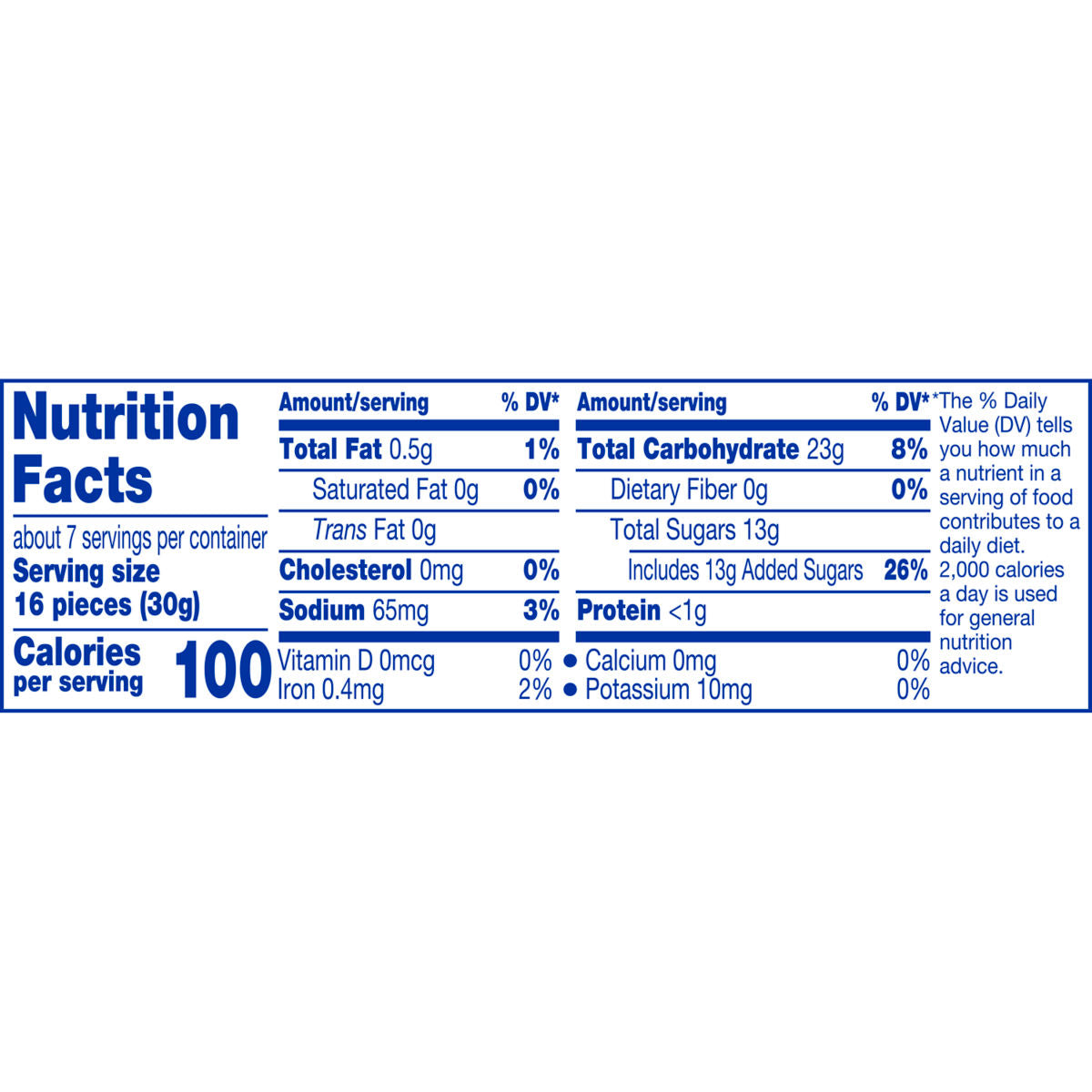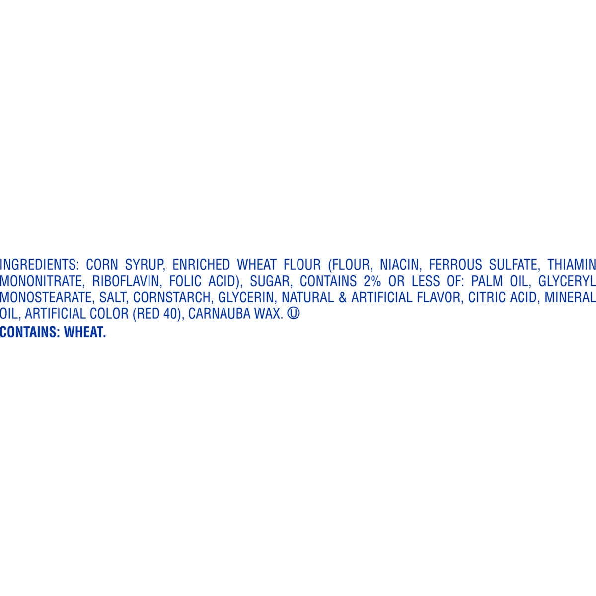 Ingredients: Corn syrup, enriched wheat flour (flour, niacin, ferrous sulfate, thiamin mononitrate, riboflavin, folic acid), sugar, contains 2% or less of: palm oil, glyceryl monostearate, salt, cornstarch, glycerin, natural and artificial flavor, citric acid, mineral oil, artificial color (red 40), carnauba wax.