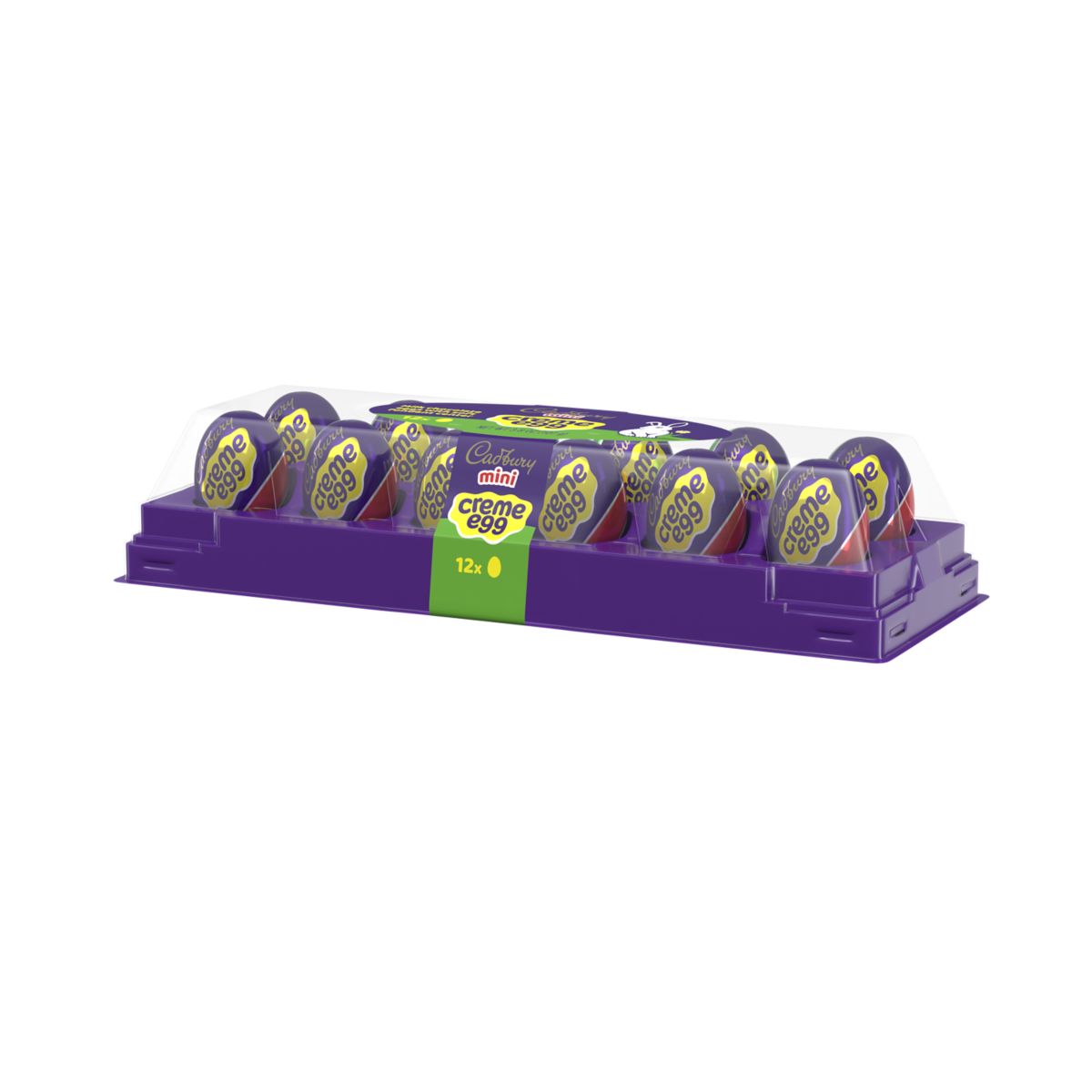 The classic Easter egg candy, the Cadbury Creme Egg, in mini form, packed in a mini carton of 12. Each foil-wrapped milk chocolate mini egg is filled with a soft fondant creme center.