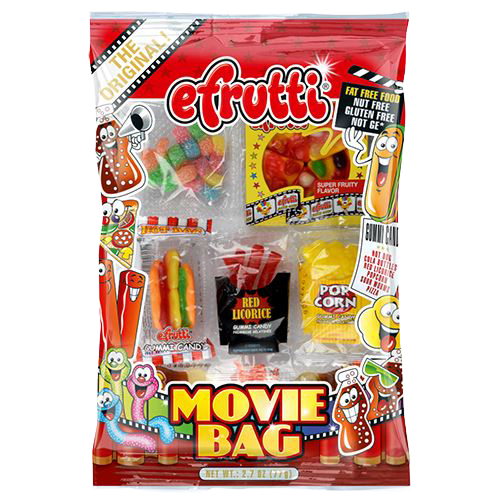 Everything the gummi lover will need for a sweet movie night. The efrutti Movie Bag includes: one Hot Dog, Red Licorice Fries, two Cola Bottles, a bag of Pop Corn, a Gummi Pizza and some sour Glow Worms.
