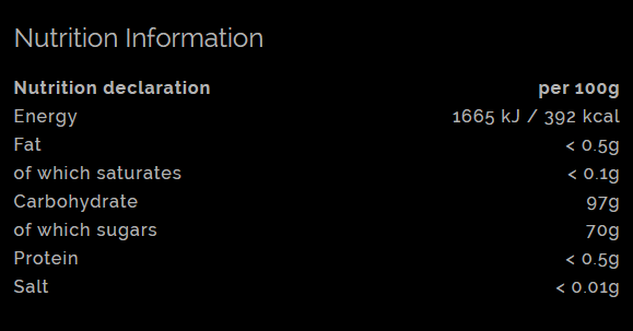Ingredients: Glucose syrup, sugar, orange juice concentrate 1%*, acid: citric acid; colouring plant extracts (yellow carrot, beetroot), natural orange flavouring.