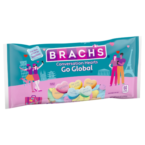 Brach's Conversation Hearts Go Global bring love to life in 13 languages! From Danish 'hygge' to Spanish 'amigo' and Thai 'suay,' these colorful hearts let you express affection in creative ways. Perfect for sharing sweet messages with friends and loved ones around the world. 8.5 oz. bag.