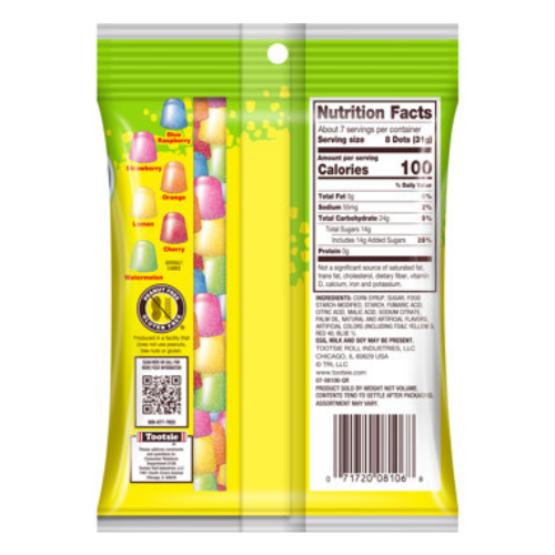 DOTS Sour Gummies bring a tangy twist to the classic DOTS gumdrop shape, with chewy candy pieces coated in sour crystals for a sweet-and-sour bite. Each bag includes bold flavors like Cherry, Lemon, Strawberry, Watermelon, and Blue Raspberry. A fun choice for candy dishes, party favors, movie night, road trip snacks, or sharing with sour candy fans.