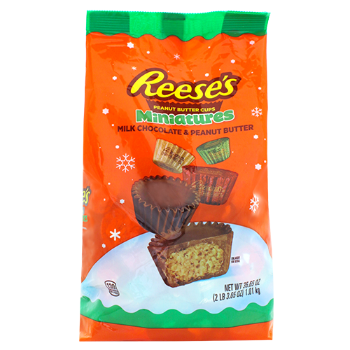 Reese's Holiday Peanut Butter Cup Miniatures come wrapped in bright red, green, and gold foils, perfect for festive fun! Each mini cup is packed with creamy peanut butter and chocolate, individually wrapped to stay fresh. Share these tasty treats at parties, gatherings, or any holiday celebration. Ready to spread holiday cheer!