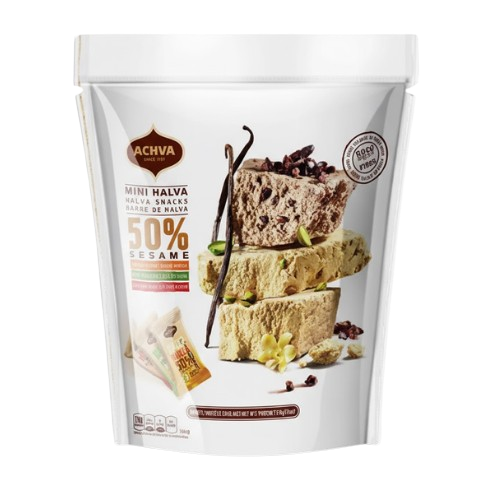 These mini halva snacks are a sweet, flaky treat made from sesame tahini. Perfect for a quick snack, spreading on toast, or mixing into desserts like ice cream and cookies. They’re tasty, and a great source of fiber—snack happy anytime!