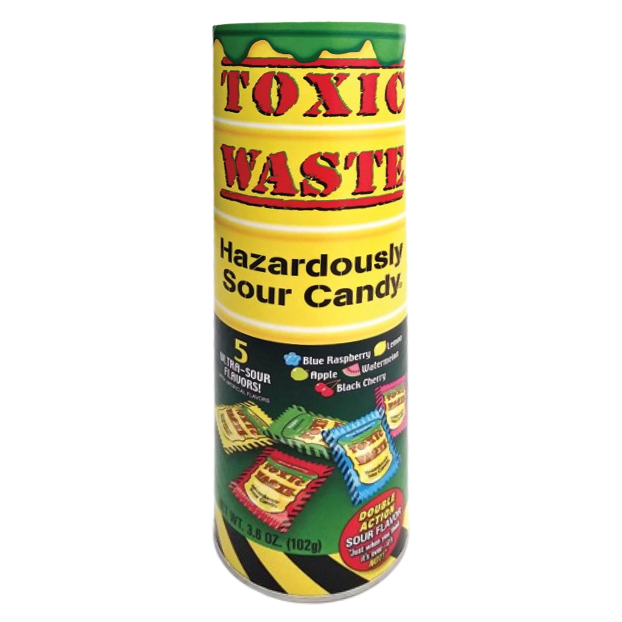 This 9" tube-shaped bank is filled with individually wrapped Toxic Waste Hazardously Sour Hard Candy. There are five ultra-sour flavors, including Blue Raspberry, Lemon, Apple, Watermelon, and Black Cherry.