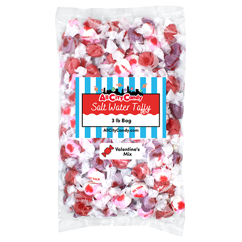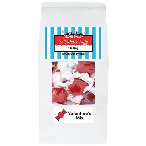 Celebrate Valentine’s Day with festive Valentine’s Salt Water Taffy, a soft and chewy classic made for sharing the love. This colorful assortment features fruity favorites including Strawberries & Cream, Cherry, and Grape, each piece bursting with sweet flavor and wrapped individually in Valentine-themed wrappers decorated with red hearts and love messages.