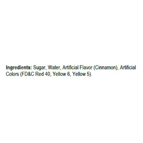 Ingredients: Sugar, water, artificial flavor (cinnamon), artificial colors (FD&C red 40, yellow 6, yellow 5).