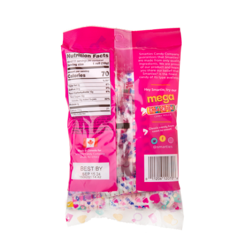 The great taste of Smarties only better! These sweet and tart candies are perfect for Valentine's Day, weddings or just when you want to show some love because everything tastes better when it's shaped like a heart! You'll find cute sayings on these extra-large Smarties, just like conversation hearts, but with that irresistible Smarties flavor!