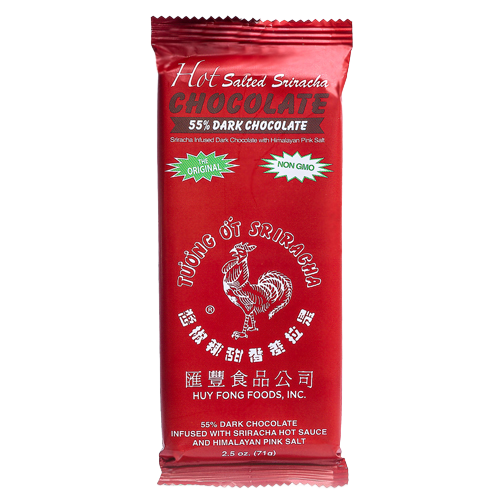Are you a sriracha fanatic? You're going to have to try this Hot Salted Sriracha Chocolate! Huy Fong sriracha hot sauce and Himalayan pink salt are mixed with 55% dark chocolate for a rich taste with a hot spice that slowly radiates on your taste buds. A great gift idea for someone who likes it hot!